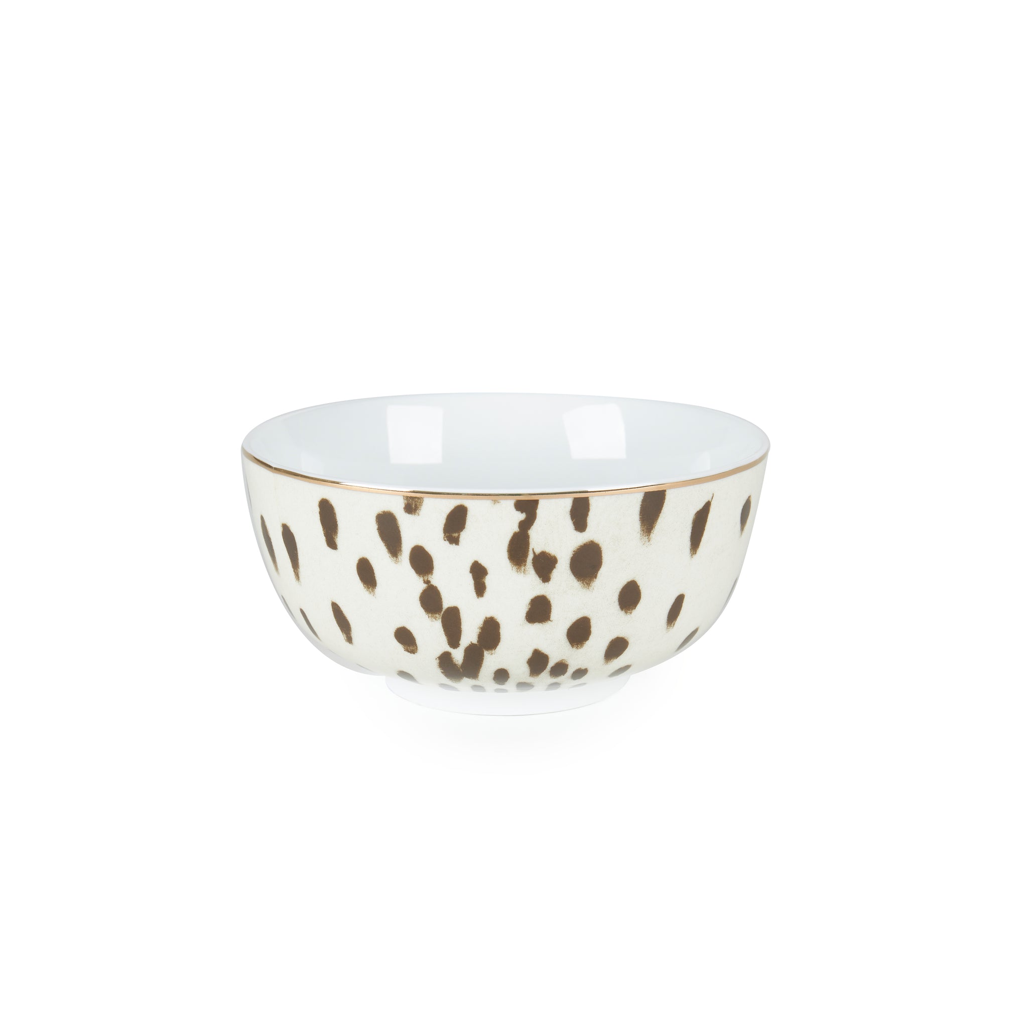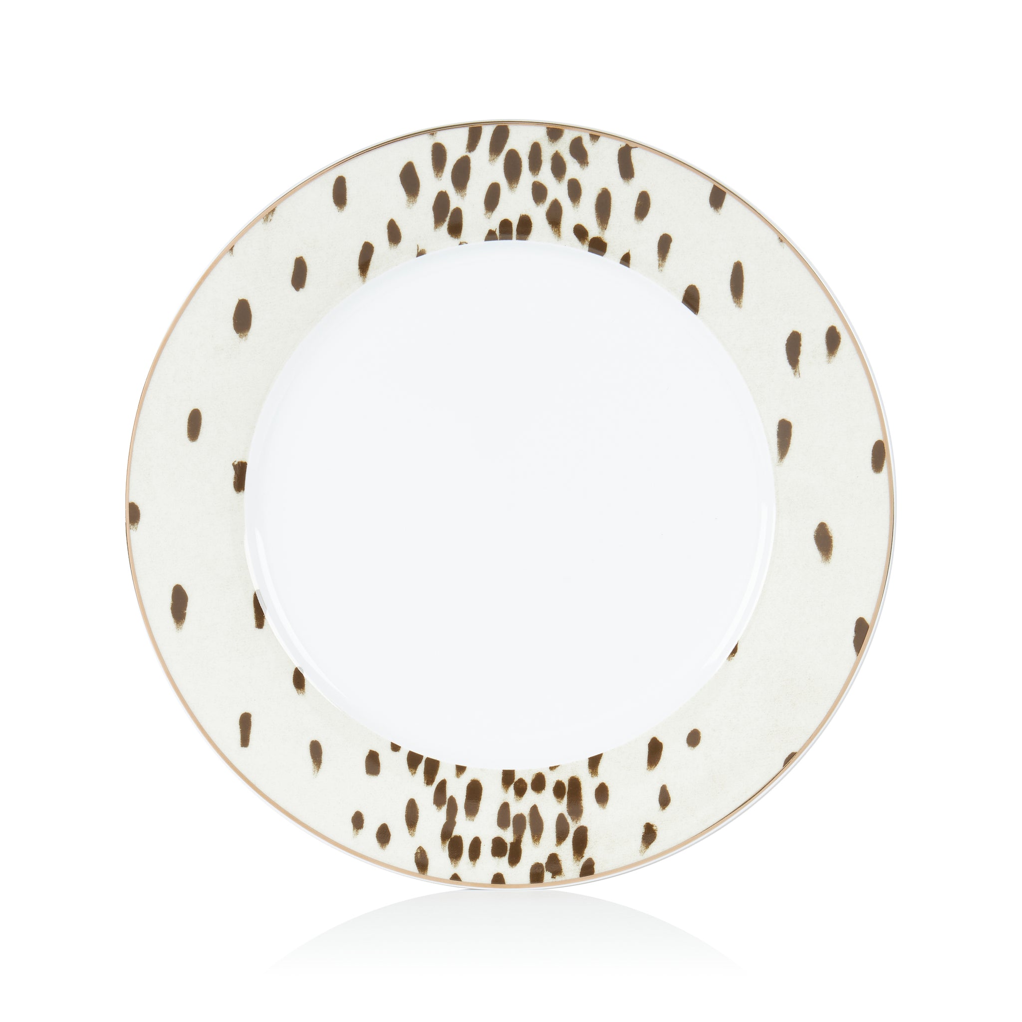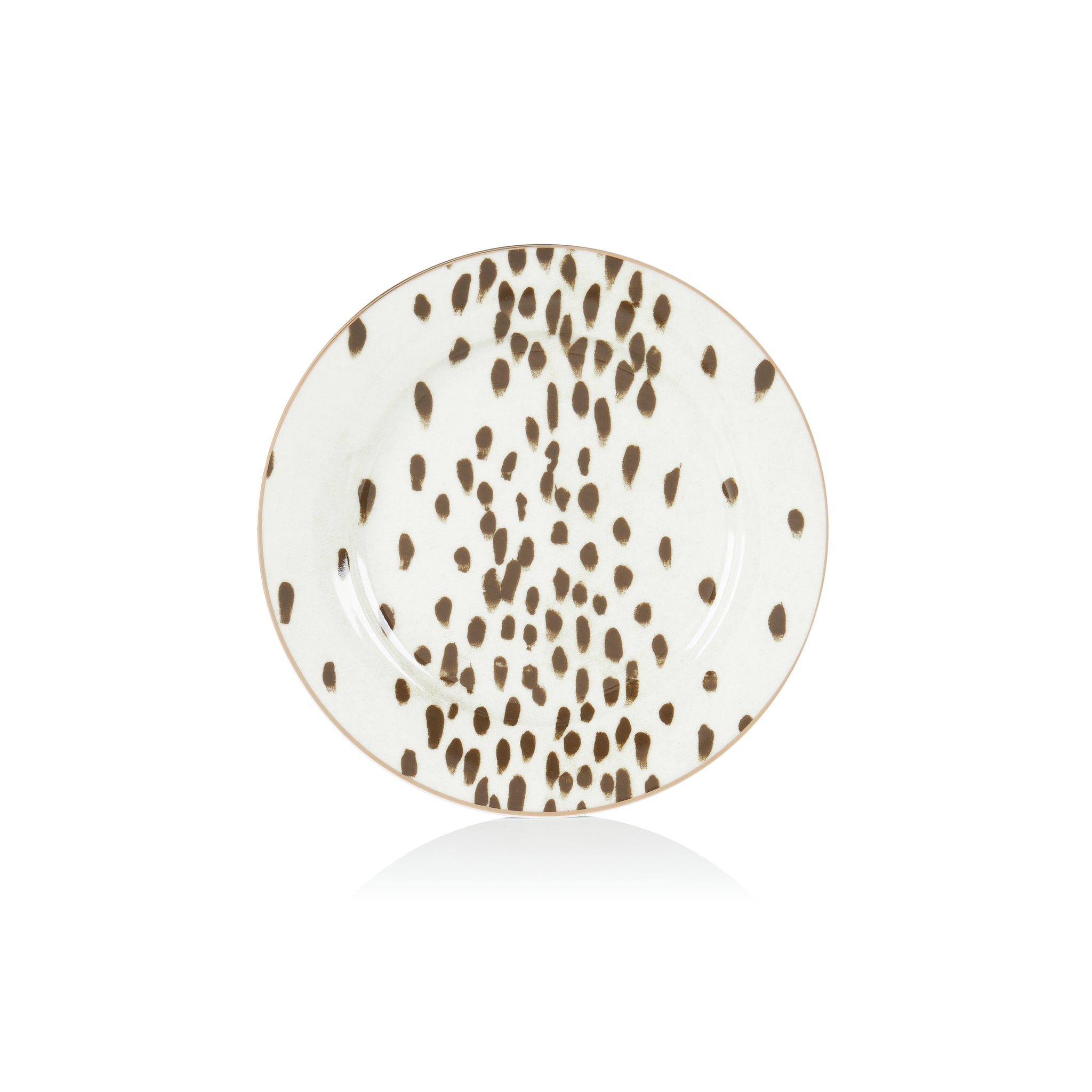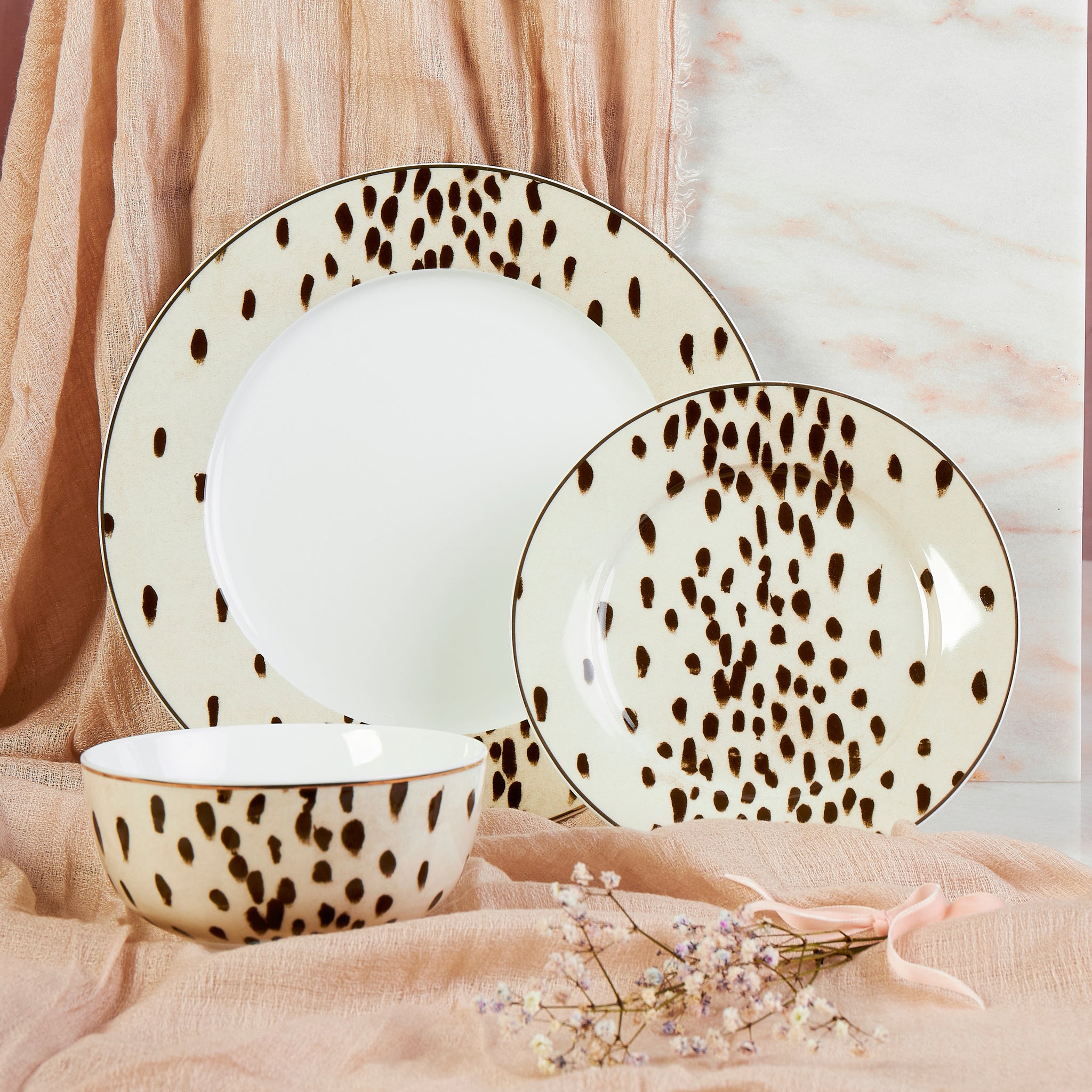 This 12 piece set includes 4 dinner plates, 4 side plates, and 4 bowls, each designed with the striking Tottenham Dalmatian print—a sophisticated blend of cocoa brush-stroked spots, presenting a modern twist on the classic Dalmatian pattern.